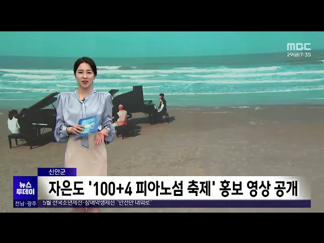 ◀ 앵 커 ▶ 오늘의 간추린 뉴스입니다. 신안군은 피아노 섬으로 지정된 자은도 해변에서 촬영한 '100+4 피아노섬 축제' 홍보 영상을 공개했습니다. 올해 2회째를 맞는 이번 축제 홍보 영상은 다양한 피아노 연주와 아름다운 섬의 풍경과 해변, 파도 등을 배경으로 제작해 '신안 만의 멋'을 담아냈습니다. 자은도 피아노섬 축...