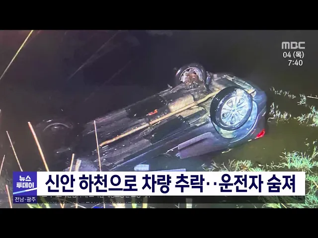 어제(3) 밤 11시55분쯤 신안군 도초면의 한 도로에서 SUV차량이 하천으로 추락해 운전자 김 모씨가 숨졌습니다. 경찰은 목격자와 차량 블랙박스 분석 등을 토대로 정확한 사고 경위를 조사하고 있습니다.