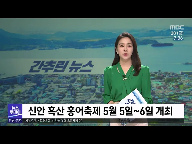 ◀ANC▶ 오늘의 간추린 뉴스입니다. 신안 흑산도에서 5월 5일부터 이틀 동안 '2023년 흑산도 홍어축제'가 열립니다. 이번 축제는 홍어 비빔밥 만들기, 풍어제, 깜짝 경매 등이 펼쳐지며 가족단위 관광객이 즐길 수 있는 다양한 부대행사도 마련됐습니다. ---------- 정남진 물 과학관이 3개월 간의 새단장을 마치고 5월 3...