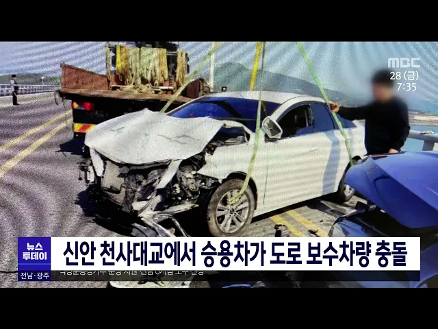 신안 천사대교에서 승용차가 도로 보수차량 충돌