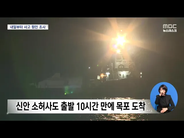 ◀ANC▶ 서해상에서 전복된 '청보호'가 오늘 목포로 예인됐습니다. 내일부터는 본격적인 사고 원인 조사가 시작됩니다. 목포해경 전용부두에 나가 있는 취재기자 연결해 보겠습니다. 박종호기자.. '청보호'가 해경부두로 들어왔나요? ◀END▶ ◀VCR▶ 네, 지난 4일 서해상에서 전복됐던 '청보호'가 목포해경 전용부두로 ...