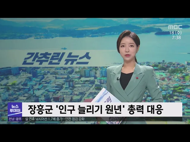 ◀ANC▶ 오늘의 간추린 뉴스입니다. 장흥군이 2023년을 인구 늘리기 원년으로 삼고 인구 4만명 회복에 박차를 가하고 있습니다. 장흥군은 인구감소와 지역소멸 등에 효과적으로 대응하기 위해 인구청년정책과를 신설했으며 장흥군 인구정책의 방향성 확립 등을 위한 중장기적인 인구감소지역대응 기본계획을 수립할 예정입...