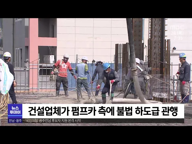 ◀ANC▶ 광주 아이파크 붕괴사고의 원인 중 하나는 콘크리트 부실 시공이었는데요. 콘크리트 부실 시공을 유발할 수 있는 타설작업 불법 하도급을 여전히 건설업체가 노동자들에게 강요하고 있다는 주장이 제기되고 있습니다. 강서영 기자입니다. ◀VCR▶ 여수의 한 공사장. 펌프카에서 콘크리트 반죽이 쏟아져 나옵니다....