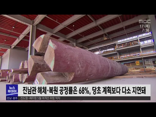 ◀ANC▶ 여수지역의 유일한 국보인 진남관은 지난 2013년, 심각한 구조 불안정으로 전면 해체 보수가 결정됐습니다. 현재 전체 복원률은 68%로, 당초 계획보다 완공시기가 조금 늦어지고 있고 내년 말쯤, 일반에 공개될 예정입니다. 국보 진남관의 해체.복원 현장을 최우식 기자가 취재했습니다. ◀VCR▶ 국보 제304호 진...