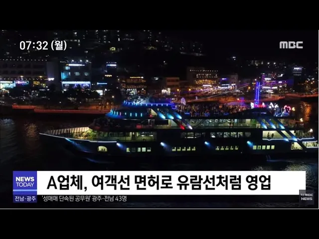 ◀ANC▶ 아름다운 조명과 함께 밤바다를 누비는 유람선은 여수의 주요 관광 상품 가운데 하나입니다. 얼마 전 여수의 한 유람선 업체가 여객선 면허로 유람선 영업을 한다며 검찰에 넘겨졌는데, 이같은 사실을 두고 업체들과 관계기관 사이에 갑론을박을 벌이고 있습니다. 강서영 기자입니다. ◀VCR▶ 알록달록한 조명을 ...