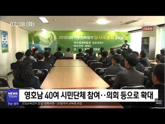 ◀ANC▶ 'UN기후변화협약 당사국총회'를 여수등 남해안 남중권을 중심으로 개최하자는 움직임이 시민사회를 중심으로 다시 점화되고 있습니다. 먼저 민간 영역의 힘을 모아 정부와 정치권을 설득해 나가자는 취지로 영호남 추진 협의체가 출범 합니다. 박광수 기자가 보도합니다. ◀END▶ 영호남 남중권 9개시군의 시민 ...