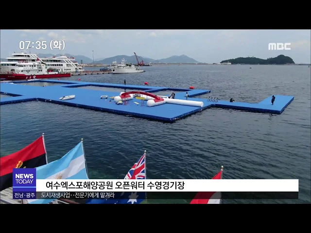 ◀ANC▶ 광주세계수영선수권대회가 이제 나흘앞으로, 여수에서 벌어지는 오픈워터 수영경기는 닷새앞으로 다가왔습니다. 유일한 야외 경기장인 여수엑스포해양공원 오픈워터수영경기장도 선수단과 관객을 맞을 채비를 모두 마쳤는데요, 박광수 기자가 경기장 찾아봤습니다. ◀END▶ 여수엑스포 해양공원내 스카이 타워 앞...