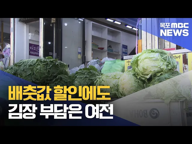 ◀ 앵 커 ▶한때 한 포기에 1만 원을 넘던 '금배추'와 무 등김장재료 가격은 조금씩 떨어지고 있습니다.정부 예산으로 마트와 전통시장에서는 김장재료 할인행사가 시작됐지만여전히 오른 가격에경제적 부담은 큽니다.김단비 기자입니다.◀ 리포트 ▶여수의 한 마트입니다.김장철 할인 행사가 한창이지만매대 앞은 한산합니다....