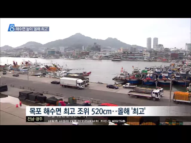 전남 해안의 해수면 높이가 상승하면서 목포 등 곳곳에서 도로 침수가 잇따랐습니다. 오늘(18) 오후 3시 49분 목포 해안지역의 바닷물 수위가 최고 520센티미터를 기록하면서 '경계' 단계가 발령됐으며, 만조 이후 바닷물이 서서히 빠져나가면서 현재는 '관심'단계로 낮아졌습니다. 목포에서는 동명동 일대와 김대중노벨평...