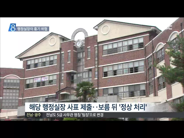 ◀ANC▶ 여수의 한 고등학교 행정실장이 학교에서 흉기를 들고 학생들을 위협한 일이 뒤늦게 알려졌습니다. 이 행정실장의 사표는 이미 처리됐는데, 그동안 학교는 교육청에 이 사건을 알리지 않아 은폐 의혹까지 일고 있습니다. 권남기 기자입니다. ◀VCR▶ 지난달 19일 저녁 9시쯤, 여수의 한 마이스터고에 근무하는 50...