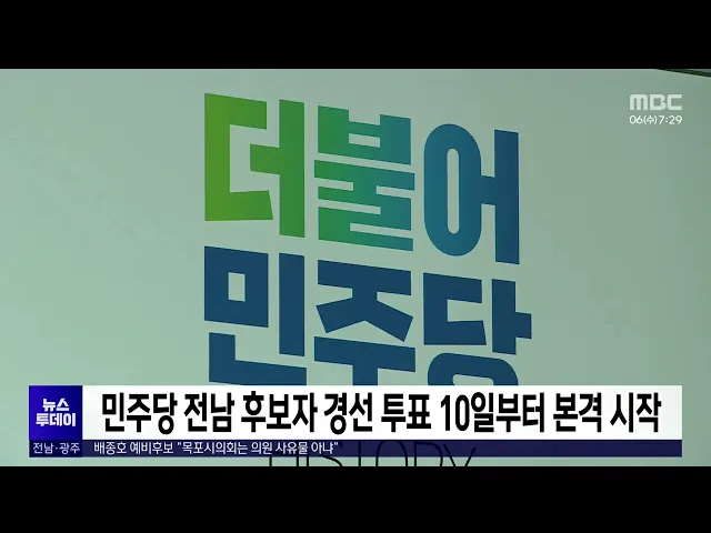 더불어민주당 전남지역 총선 후보자 경선투표가오는 10일부터 본격 시작됩니다.더불어민주당은목포와 고흥보성장흥강진, 순천광양곡성구례 갑 등 3개 선거구 경선투표를오는 10일부터 12일까지 진행합니다.또 여수 갑,을과 영암무안신안, 해남완도진도 등의 선거구는 3월 11일부터 사흘동안 경선투표를 실시해 후보를 확정...
