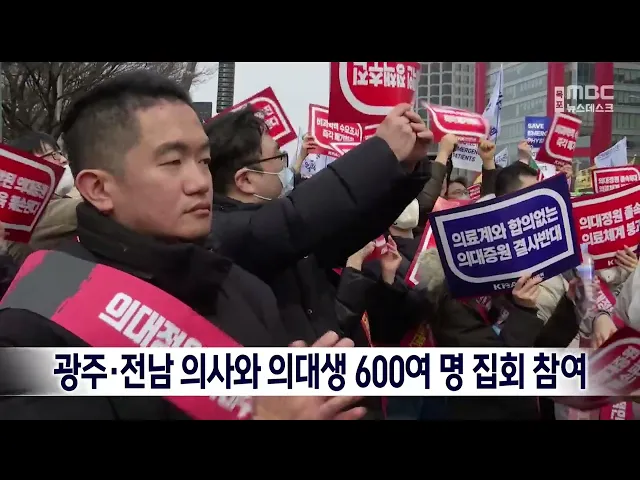 정부의 의대 정원 방침 등에 반대하는서울 대규모 집회에 광주·전남에서 600여 명이참여한 것으로 알려졌습니다. 광주*전남의사회에 따르면 전남에서는 목포와 순천 여수 등협회 소속의사 200여 명이 서울로 향했으며, 광주에서도 의사 200여 명과전남대와 조선대 의대 학생 200여 명 등이서울에서 열리는 전국의사총궐기...