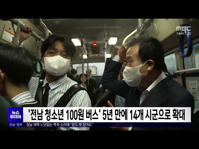 전남 청소년 100원 버스가도입 5년 만에 14개 시군으로 확대되면서전남지역 대표적 청소년 교통복지 정책으로자리매김하고 있습니다.청소년 100원 버스는 거리에 상관없이 교통카드로 100원만 결제하면 해당 지역 시내버스와 농어촌버스를 이용할 수 있습니다.청소년 100원 버스는현재 목포와 여수, 순천, 무안 등14개 시군...