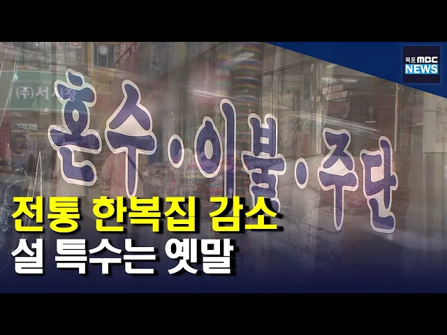 ◀ 앵 커 ▶설 명절이면한복을 곱게 차려입는 풍속도점차 사라지고 있습니다.시대가 변하고 손님들의 발길이 줄면서 한복업을 잇는 상인들의 시름이 깊습니다. 최황지 기자입니다.◀ 리포트 ▶군데군데 세월의 흔적이 보이는 낡은 한복가게. 색색의 저고리와 치맛자락에는 은은한 빛깔이 감돕니다.여수 서시장에서만70년간 운영...