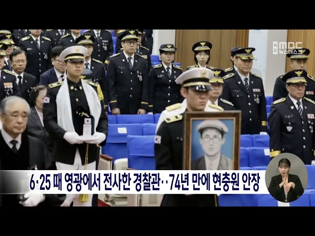 6.25 전쟁에서 전사한 경찰관의 유해가 순국 74년만에 현충원에 잠들었습니다.경찰청은 어제(27) 국립 대전현충원에서 6.25 전사자 유해발굴사업을 통해 뒤늦게 신원이 확인된 고 김명손 경사에 대한유해 안장식을 거행했습니다.6.25 전쟁 당시 전남경찰국 소속 2백명의 경찰관이 참여한 영광 삼학리 전투에서 전사한고 김 ...
