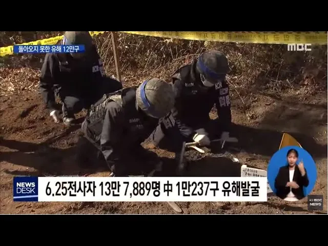 ◀ANC▶ 오늘(1)은 국군의 날입니다. 국군의 날은 6.25 전쟁 당시 한국군이 38선을 돌파한 날을 기념해 제정됐는데요, 이 6.25 전쟁에 참전한 국군 전사자의 유해 12만여 구가 아직도 발굴되지 못한 채 산천 어딘가에 잠들어 있고, 그나마 발굴된 유해마저도 대부분 신원 확인이 안 되는 상황이라고 합니다. 조희원 기자입...