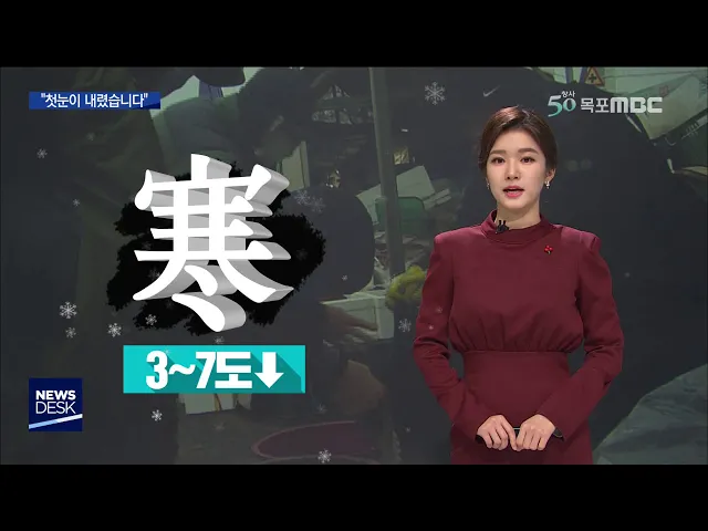 ◀ANC▶ 절기상 대설인 목포에도 첫눈이 내렸습니다. 첫눈과 한파 소식, 박소영 아나운서입니다. ◀END▶ [돌출 설(雪)] 어제 눈이 내린 영광을 제외하고 목포 등 전남지역에서 첫눈이 관측됐습니다. 눈은 전남 동부 남해안을 빼고 확대돼 내일(8일)까지 이어지겠습니다. C/G]예상 적설량은 서해안 지역은 2에서 7센티미...