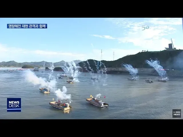 ◀ANC▶ 해남과 진도 울돌목에서는 421년 전. 명량대첩의 영광이 다시 꾸며졌습니다. 주민과 관객이 한데 어우러져 당시 생생했던 명량해전의 감동을 체험했습니다, 장용기기자입니다, ◀END▶ 최대 시속 24km 동양에서 물살이 가장 빠른 울돌목 협수로 밀물과 썰물이 뒤바뀌기 직전 잠시 물흐름이 멈춘 정조시각 왜군의 ...