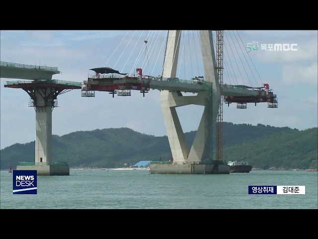 ◀ANC▶ 무안과 바다건너 영광을 잇는 칠산대교 공사가 순조롭게 이뤄지고 있습니다. 이 다리가 내년 말 완공되면 신안 새천년대교 등 해상다리 3곳을 통해 섬과 바다,육지가 연결되는 '바다명품 관광지'가 기대됩니다. 장용기기자 ◀END▶ 전남에서 가장 높은 111미터 높이의 영광 칠산타워에서 바라다 본 서해 칠산 앞...