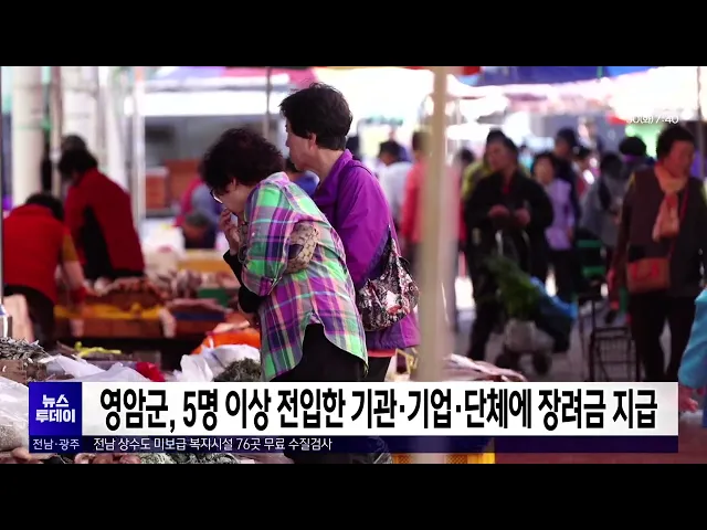 영암군은 올해 연말까지 집계해, 인구 전입에 공이 있는 기관·기업·단체에 장려금을 지원합니다.영암군은 올 연말 기준, 영암군 각 기관·기업·단체에서 가족 포함 구성원 5인 이상 전입 실적이 있을 경우, 50~300만원의 장려금을 영암사랑상품권으로 지급할 예정입니다.전입자는 다른 시·군·구에 1년 이상 주민등록이 있다...