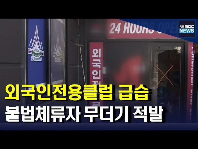 ◀ 앵 커 ▶ (전남) 영암의 한 외국인전용클럽에서불법체류중인 외국인 70명이 무더기로적발됐습니다.이들은 평소 출입문을 이중으로 잠그고CCTV와 인터폰을 통해 방문자를 확인하는 등치밀한 방법으로 단속을 피해왔던 것으로드러났습니다. 안준호 기자가 취재했습니다.◀ 리포트 ▶열려있는 문 사이로 현란한 조명 불빛이 새...