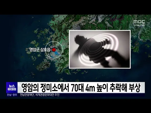 어제(6) 낮 12시 20분쯤영암군 삼호읍의 한 정미소에서작업을 하던 70대 남성이4m 높이에서 추락했습니다.이 사고로 남성이 중상을 입고 병원으로 옮겨졌지만 다행히생명에는 지장이 없는 상태이며,경찰은 관계자 진술 등을 토대로정확한 사고 경위를 조사하고 있습니다.