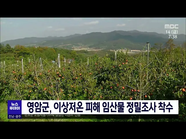 영암군이 최근 이상저온으로 피해가 발생한 임산물에 대해 농가별 정밀조사에 착수했습니다. 영암에서는 지난 7~8일 사이 기온이 평상시보다 2~7도가량 낮아지고 서리가 내리면서 특히 대봉감 주산지인 금정면에서는 재배면적의 65% 이상이 냉해피해가 발생한 것으로 추정되고 있습니다.