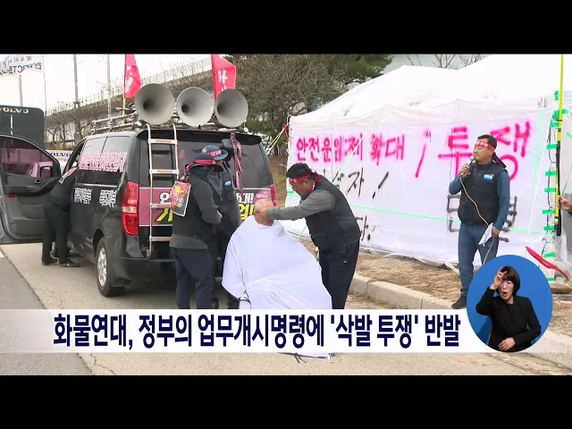 정부가 화물연대 총파업에 업무개시명령을 발동하자 화물연대는 삭발 투쟁을 전개하며 반발하고 있습니다. 화물연대는 오늘, 영암 대불항과 광양항 부두 등에서 결의대회를 열고 정부의 업무개시명령에 대한 규탄과 함께 안전운임 일몰제 폐지를 요구했습니다. 현재 전남에서는 7개 시군, 21개 거점에서 850여명의 노조원들...