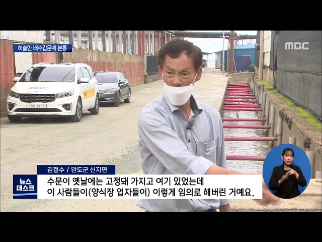 ◀ANC▶ 완도의 한 수산자원보호구역이 불법으로 훼손된 사실 보도해 드렸는데요, 이 지역에서는 농지에 염해피해도 발생하고 있습니다. 육상양식장에서 쏟아지는 바닷물이 허술한 배수갑문을 통해 인근 논으로 스며들고 있습니다. 김 윤 기자가 취재했습니다. ◀END▶ 완도군 신지면의 육상 양식단지입니다. 양식장 배...