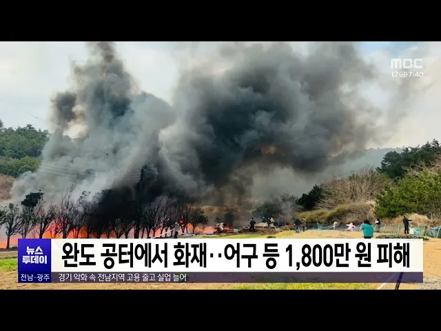 어제(16) 오후 4시 10분쯤완도군 노화읍의 한 공터에서 불이 나어구 등이 타면서 소방서 추산1,800만 원 재산 피해를 낸 뒤2시간여 만에 꺼졌습니다.경찰과 소방 당국은 쓰레기를 소각하다가어구로 불이 옮겨붙은 것으로 보고정확한 화재 원인을 조사하고 있습니다.