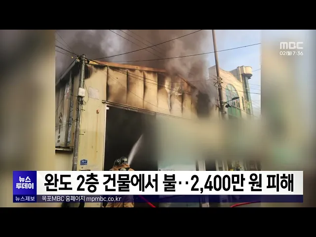 어제(1) 오후 4시 10분쯤 완도군 완도읍의 한 2층짜리 건물에서 불이 나 1시간 만에 꺼졌습니다.이 불로 2층 가정집 일부와안에 있던 텔레비전, 냉장고 등이 타소방서 추산 2천4백만 원의 재산피해가 났으며 경찰과 소방당국은 정확한화재 원인을 파악하기 위해합동감식을 실시할 예정입니다.