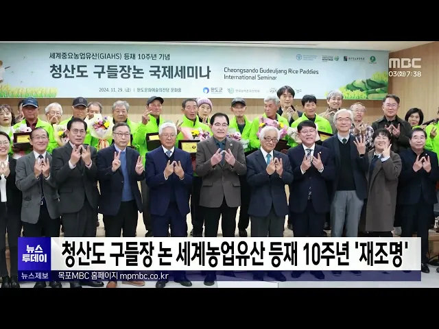 완도 청산도 구들장 논의세계중요농업유산 등재 10주년을 기념하는 국제 세미나가 열렸습니다.완도군이 개최한 이번 세미나에는국내외 전문가들이 참석해청산도 구들장 논 세계중요농업유산 등재 이후10년 간의 보전, 관리활동을 재조명하고변화하는 환경에 대응하기 위한농업시스템 발전 방향을 모색했습니다.