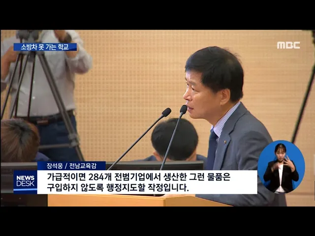 ◀ANC▶ 전남의 일부 학교들이 소방차가 제대로 진입할 수 없는 실정인 것으로 나타났습니다. 학교 현장에서 일본 전범기업의 물품을 쓰는 문제도 도마 위에 올랐습니다. 전남도의회의 도정질문 마지막 날 소식을 양현승 기자가 전해드립니다. ◀END▶ ◀VCR▶ 높은 언덕길을 지나야 하는 전남의 한 고등학교. 학교 진...