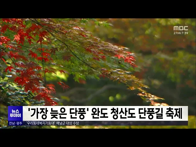 우리나라에서 가장 늦게 단풍이 물든다는완도 청산도에서 오는 29일부터 12월 2일까지단풍길 축제가 열립니다.청산도 단풍길은 30년 된 단풍나무가 3킬로미터 도로 양쪽으로 터널 형태를 띠고 있어 드라이브 코스로인기를 끌고 있으며,완도군은 단풍길을 찾은 관광객들에게 기념사진 촬영과 인화 서비스를 무료로 제공할 예...