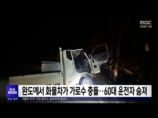 어젯밤(24) 9시 30분쯤완도군 고금면의 한 편도 1차선 도로에서 1톤 화물차가 도로 옆 가로수에 부딪혀 60대 운전자가 의식을 잃고 병원으로 옮겨졌으나 숨졌습니다.경찰은 화물차가 중앙선을 넘었다가사고가 났다는 목격자 진술을 토대로정확한 원인을 조사하고 있습니다.
