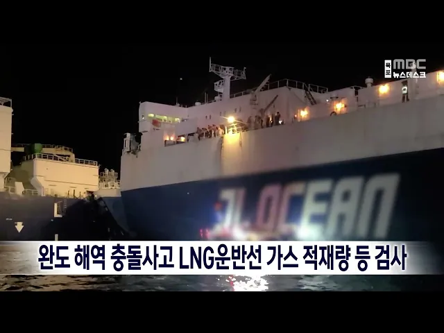 완도군 여서도 해상에서 충돌한 LNG 운반선에 대한 가스 잔량 검사 등 후속 조치가 진행되고 있습니다. 완도해경은 LNG 운반선을 완도항 남쪽 16km 해상에 정박하고, 선체에 남은 가스 잔량을 확인하는 한편, 선박의 안전진단을 위해 질소가스를 충전해 점검할 예정입니다. 한편, LNG 운반선과 충돌한 화물선은 별다른 피...