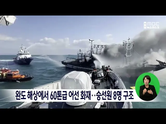 완도 해상에서 60톤급 어선 화재..승선원 8명 구조
