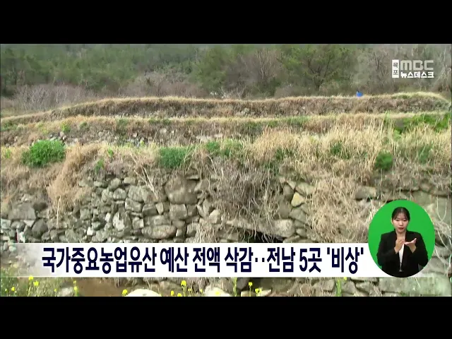 내년도 정부예산안에 국가중요농업유산 지원 예산 26억원이 전액 삭감돼 보전관리에 어려움이 예상됩니다. 이는 지난 4월 농림축산식품부가 국가중요농업유산 등의 보전관리에 지원을 확대하겠다는 것과 전면 배치되는 것으로, 완도 청산도 구들장 논 등 전남 5곳을 포함한 전국 18개 농업유산 관리에 비상이 걸렸습니다. ...