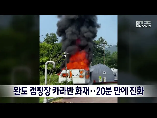 오늘(13) 오전 10시 10분쯤 완도의 한 해수욕장 캠핑장에 주차돼 있던 개인용 카라반에서 불이나 출동한 119에 의해 20분만에 진화됐습니다. 이 화재로 인명피해는 발생하지 않았지만 카라반 1대가 모두 불에 탔으며, 소방당국은 목격자 등을 상대로 정확한 화재원인을 조사하고 있습니다.