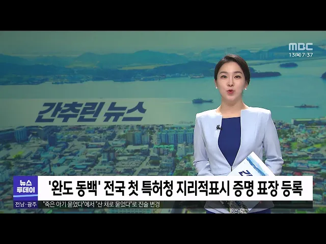 ◀ANC▶ 오늘의 간추린 뉴스입니다. 완도 동백이 전국 최초로 특허청의 ‘지리적표시 증명 표장’에 등록됐습니다. 전국 최대 동백 천연림이 있는 완도군은 완도 동백 추출 고요산혈증 치료용 조성물 특허를 보유하고 있는데 이번 지리적표시 증명 표장 등록으로 다시 한 번 완도 동백의 우수성을 입증했습니다. ------ 신안...