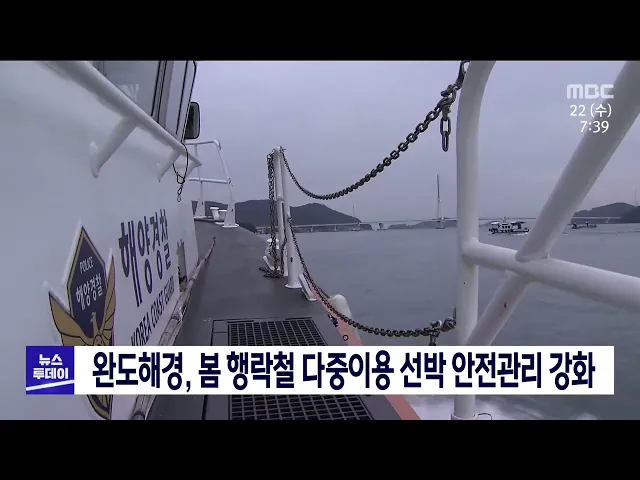 완도해경은 봄 행락철을 맞아 각종 해양사고에 대비하기 위해 다중이용 선박 안전관리를 강화합니다. 해경은 해상교통관제시스템 등과 연계해 낚시어선 영업구역 위반과 구명조끼 미착용 등을 특별단속하고 다중이용선박 현장 안전 순찰과 운항 관리 강화, 불시 인원 점검 등을 통해 안전저해 행위 여부를 확인하기로 했습...