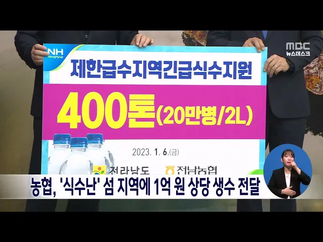 전라남도와 농협중앙회는 지속된 가뭄으로 어려운 5개 도서지역에 1억 원 상당의 생수 4백 톤을 지원했습니다. 전달된 생수는 현재 제한급수가 이뤄지고 있는 완도 노화, 보길, 금일도 등 5개 섬지역 주민 만 3천여 명에게 2주 가량 공급할 수 있는 규모입니다.