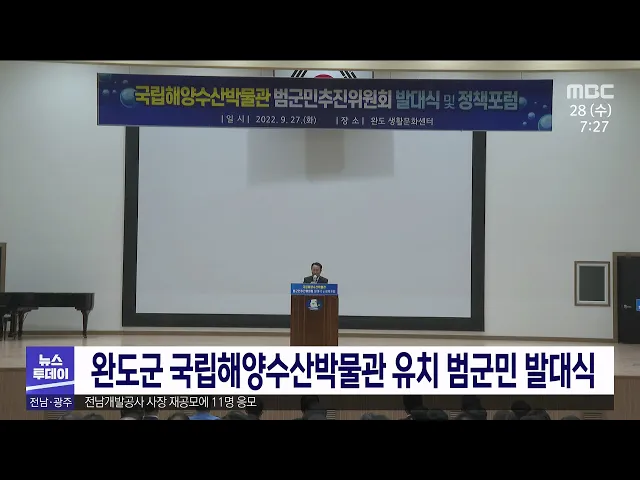 완도군이 조영택 전 장관을 위원장으로 하는 국립해양수산박물관 범군민 유치위원회 발대식을 갖고 본격적인 박물관 유치활동에 들어갔습니다. 완도군은 또 주민 공청회 형식의 정책포럼을 갖고, 국립해양수산 박물관 완도 유치 타당성과 발전 방향을 토론했습니다. 국립해양수산박물관은 해양수산부가 2024년 착공을 목표...