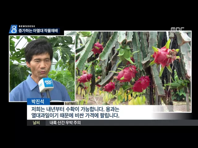 ◀ANC▶ 지구 온난화에 따라 남부지방에서는 아열대 작물을 재배하는 농가가 늘고 있습니다. 증가하는 다문화 가정도 국내 농작물 재배지도에 변화를 주고 있습니다. 최진수 기자가 보도합니다. ◀END▶ ◀VCR▶ 비닐하우스 안에 파파야가 무성하게 자라고 있습니다. 망고와 비슷한 열대과일나무입니다. S/U] 장흥의 한 ...