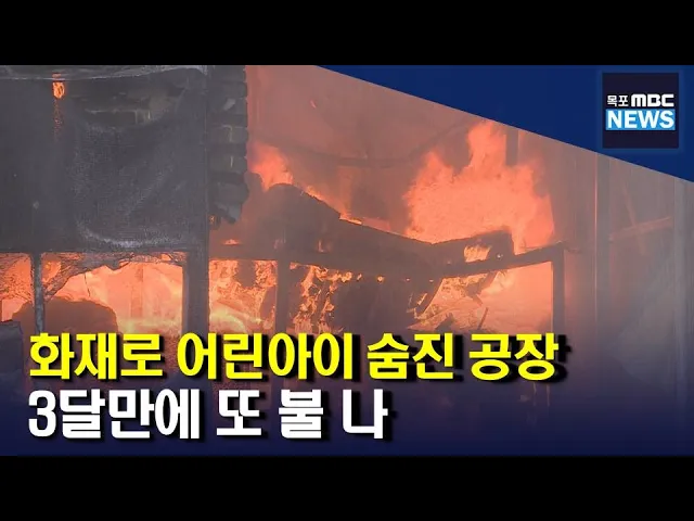 ◀ANC▶ 장흥 바이오산단의 한 식품가공공장에서 불이나 공장이 모두 불에 탔습니다. 이 공장은 석달 전, 불이나 공장 숙소에 있던 6살 어린이가 숨졌던 공장과 같은 곳입니다. 박종호 기자가 취재했습니다. ◀END▶ ◀VCR▶ 시뻘건 불길이 건물을 뒤덮었습니다. 앞이 안보일 정도로 연기가 인근으로 퍼져 나갑니다. 장...