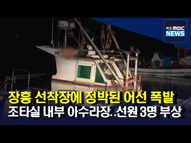 ◀ANC▶ 전남 장흥군의 한 선착장에 정박돼 있던 배에서 폭발사고가 났습니다. 선원 3명이 화상을 입고 병원으로 옮겨 졌습니다. 박종호 기자가 취재했습니다. ◀END▶ ◀VCR▶ 선박 조타실 내부가 아수라장이 됐습니다. 어제 저녁 6시 55분쯤 장흥군 관산읍 우산 선착장에 정박하고 있던 3.97톤급 어선에서 폭발사고가 ...
