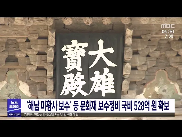 전라남도는 2023년 국가지정 문화재 보수정비사업에 국비 528억 원을 확보해 전국 광역자치단체 중 최다를 기록했다고 밝혔습니다. 올해 주요 보수정비 사업은 장흥 천관사 선원 재현과 해남 미황사 대웅전 보수, 순천 낙안읍성과 강진 영랑생가의 초가 이엉잇기 등으로 문화유산의 원형 보존과 복원, 훼손 방지 등이 추진...