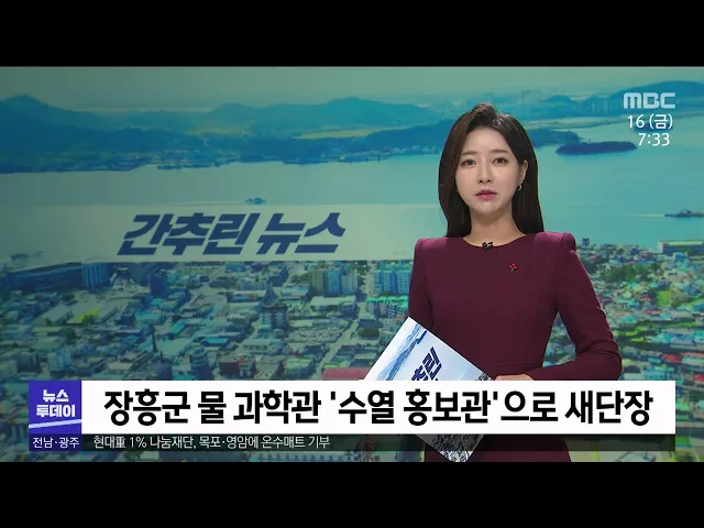 ◀ANC▶ 오늘의 간추린 뉴스입니다. 장흥군 탐진강변에 위치한 정남진물과학관이 수열홍보관으로 새단장합니다. 장흥군은 환경부 공모사업으로 선정된 '장흥형 스마트 그린도시 사업' 일환으로 물과학관에 홍보관과 4D영상관, 실감체험관을 재구성해 2023년 3월 새롭게 문을 열 예정입니다. ------- 무안군이 남악시장을 ...