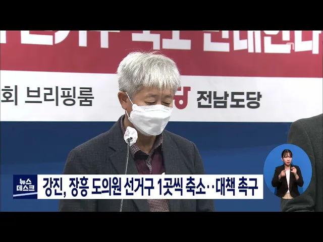 진보당 전남도당은 선거구 유지 인구 하한선 기준에 따라 내년 동시지방선거에서 강진 2선거구와 장흥 2선거구 두 곳이 폐지될 위험에 처해 있다며 대책마련을 촉구했습니다. 진보당은 농촌 선거구 축소는 농촌주민에 대한 정치주권 침해이자 지역소멸을 더욱 부추기게 될 것이라며 국회 차원의 도농간 격차 해소와 지역 ...