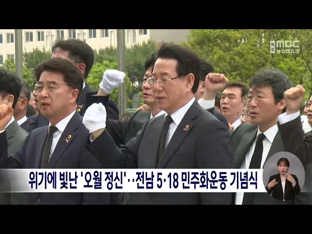 제45주년 전라남도 5.18 민주화운동 기념식이 오늘(16) 도청 앞 광장에서 열렸습니다.이번 기념식은 5.18 유공자와 유족 등400여 명이 참석한 가운데 헌화와 추념사, 12.3 계엄사태와 한강 작가의 소설 '소설이 온다'를 주제로 한 추념 공연, 임을 위한 행진곡 제창 순으로 진행됐습니다. 이 자리에서 김영록 전남지사는"민...